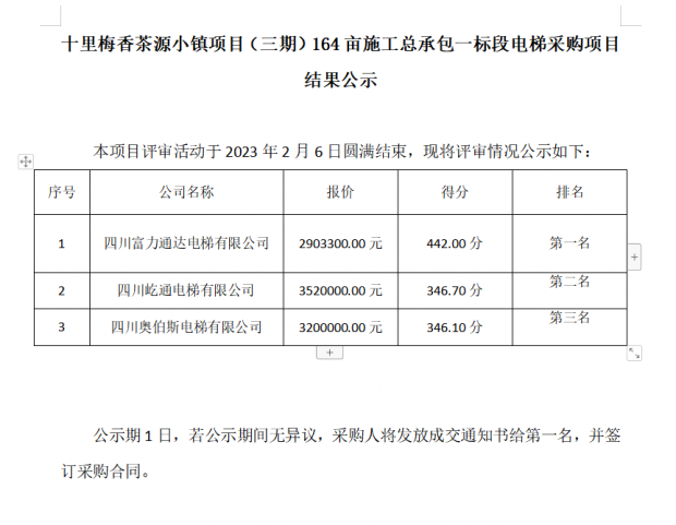 十里梅香茶源小鎮(zhèn)項(xiàng)目(三期)164畝施工總承包一標(biāo)段電梯采購(gòu)項(xiàng)目 結(jié)果公示